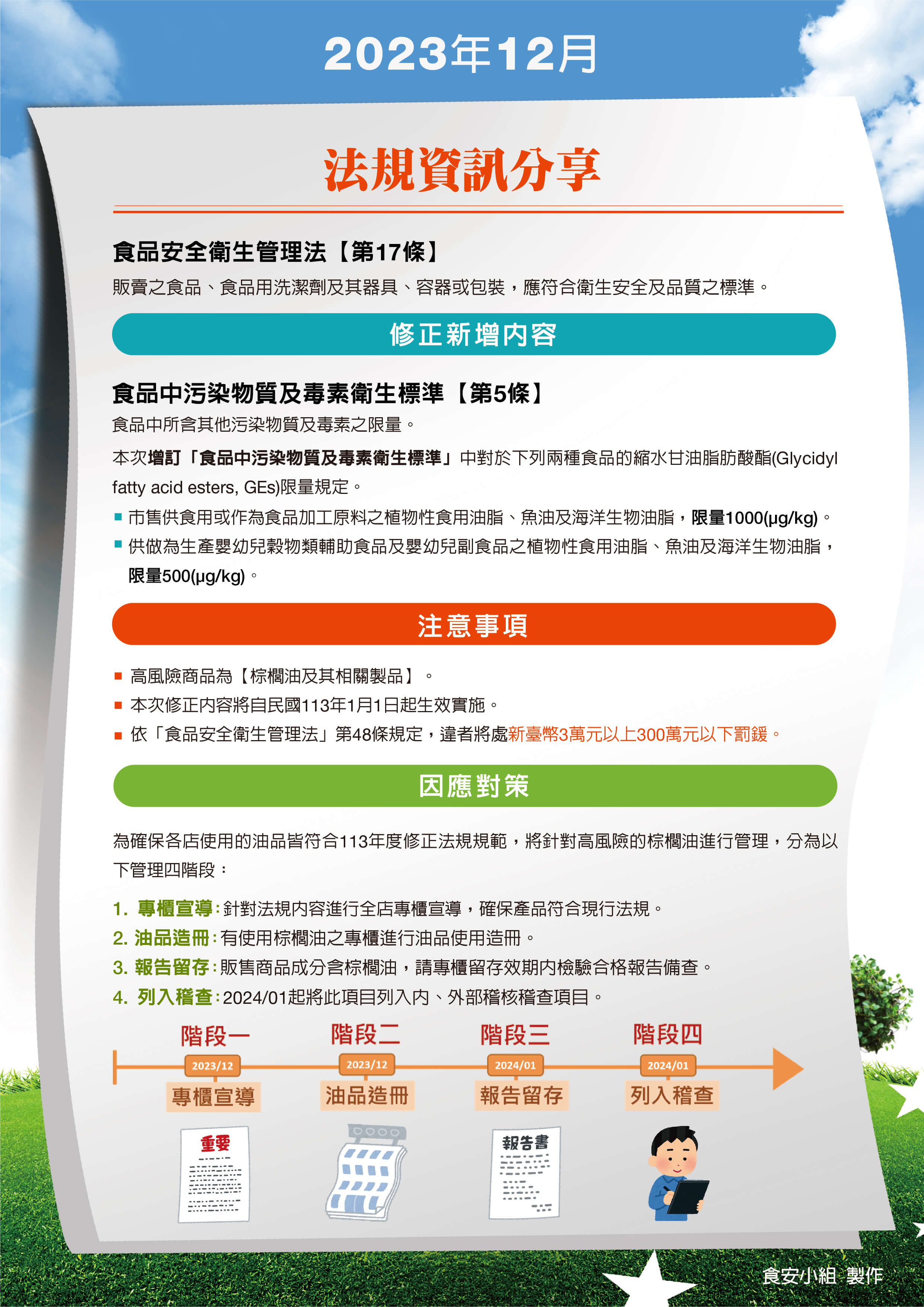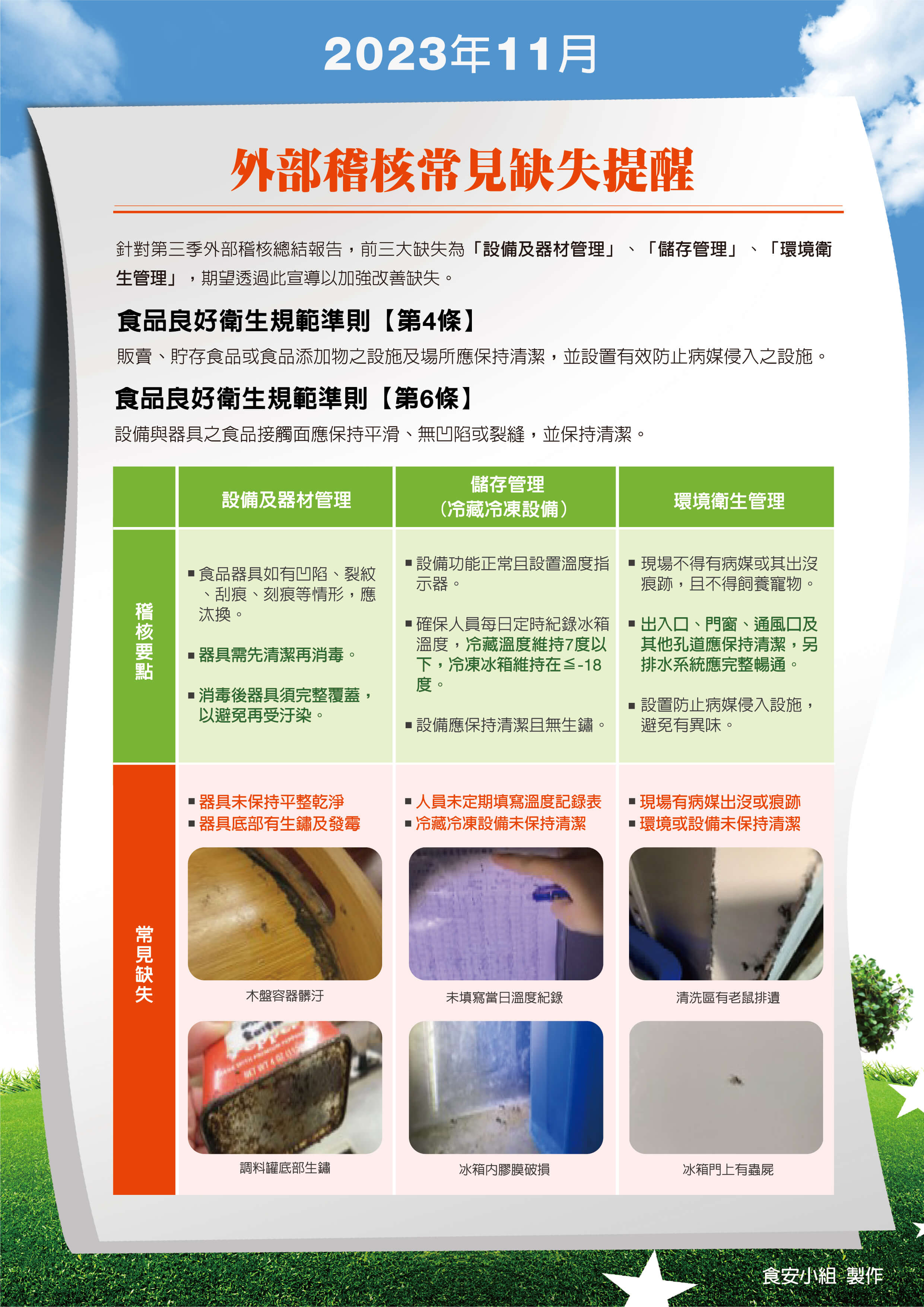 統整較常發生食安相關缺失,了解食品衛生安全風險缺口,新增三項稽核管理項目,強化食安把關。