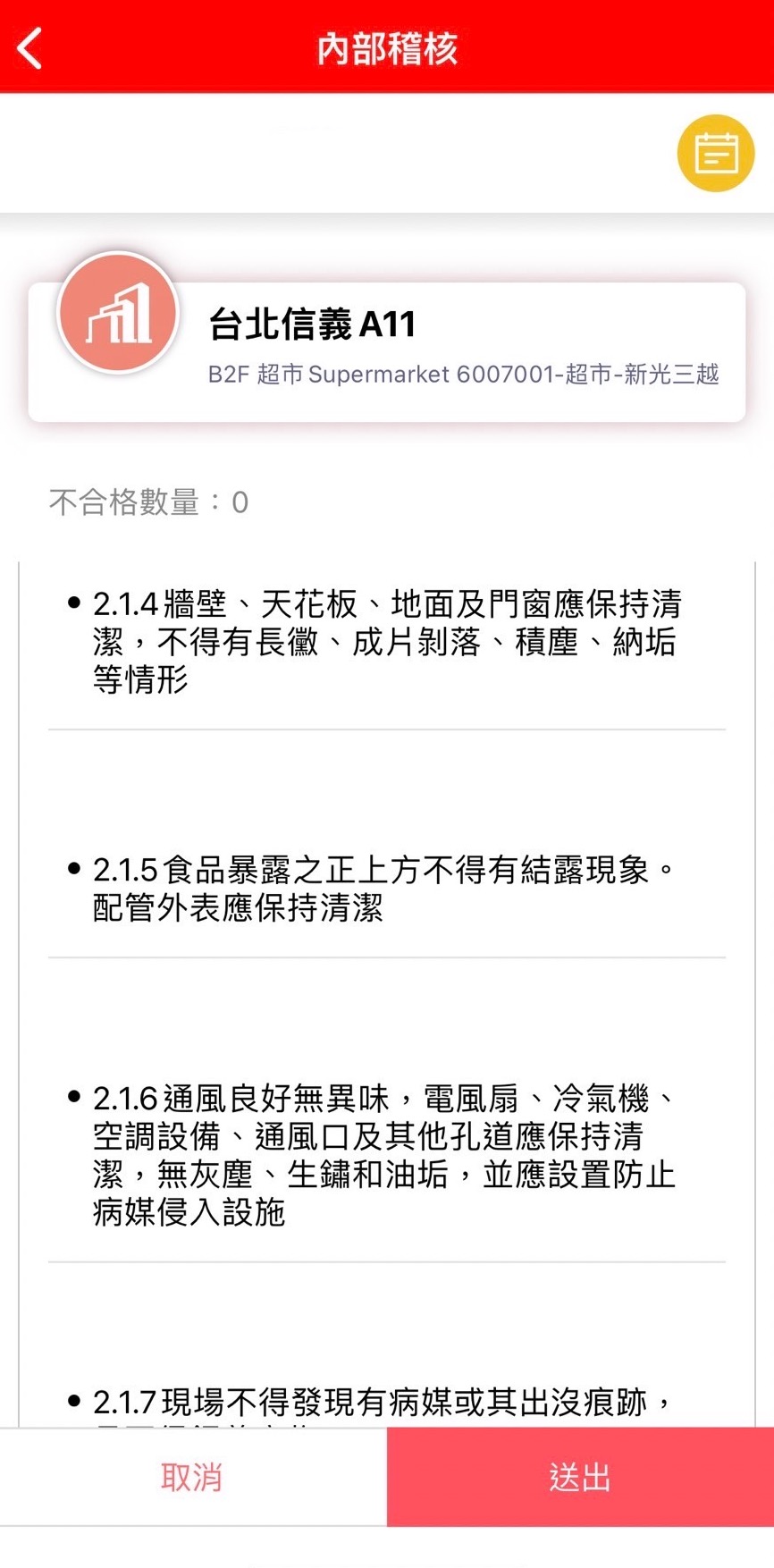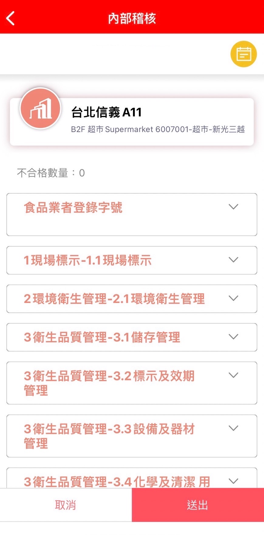 | 外部稽核 | 每季一次 | 食品抽檢、手部與器具塗抹、櫃位環境衛生 |